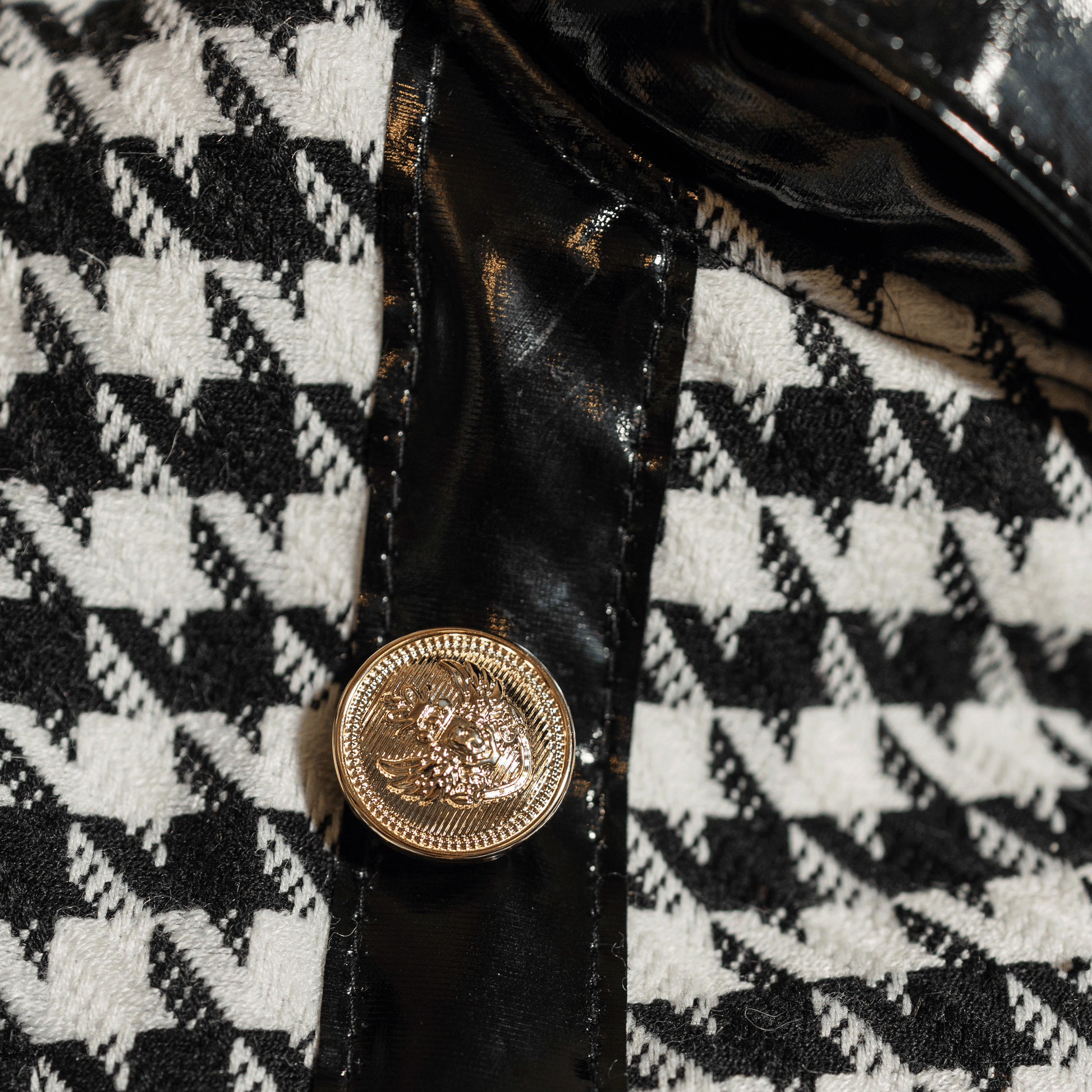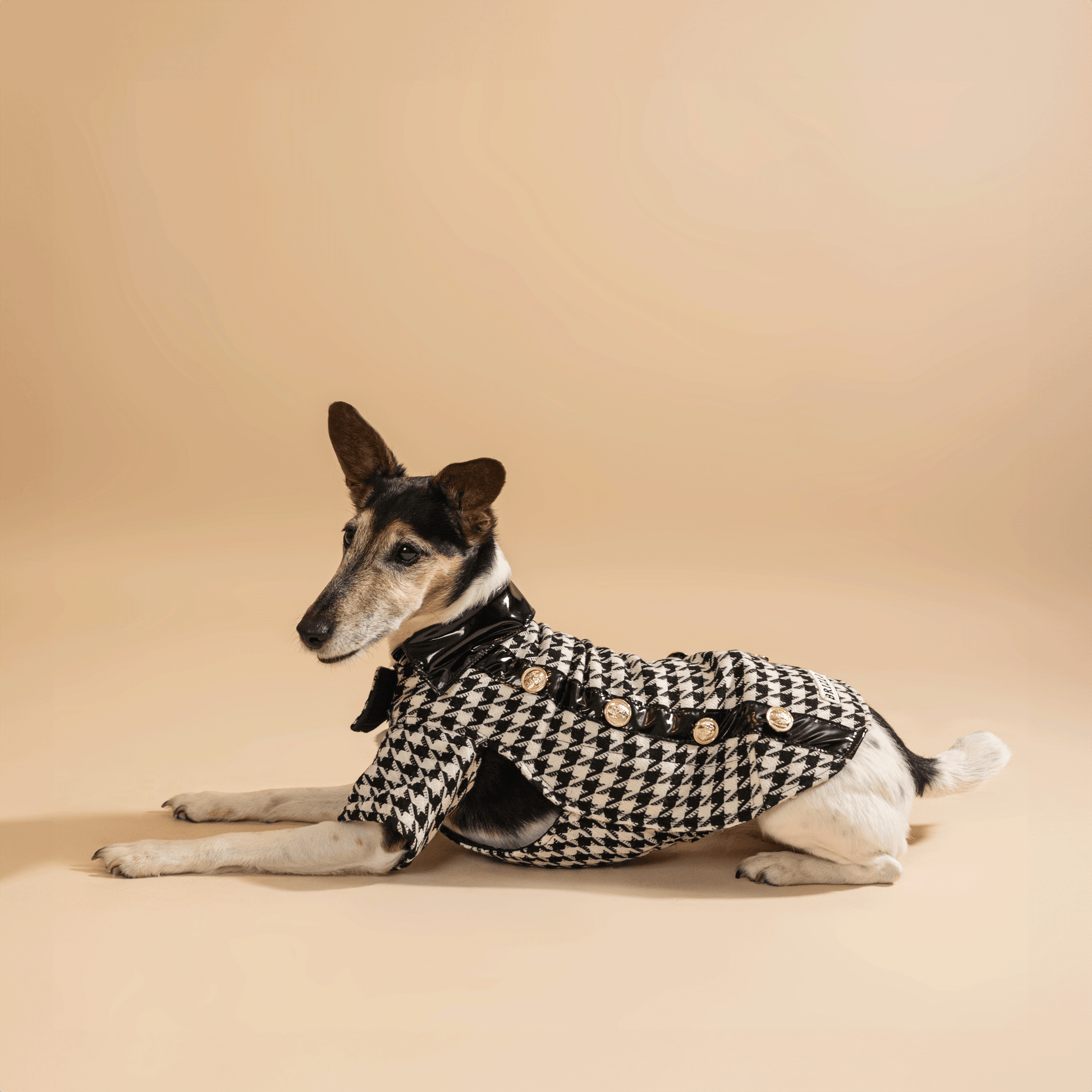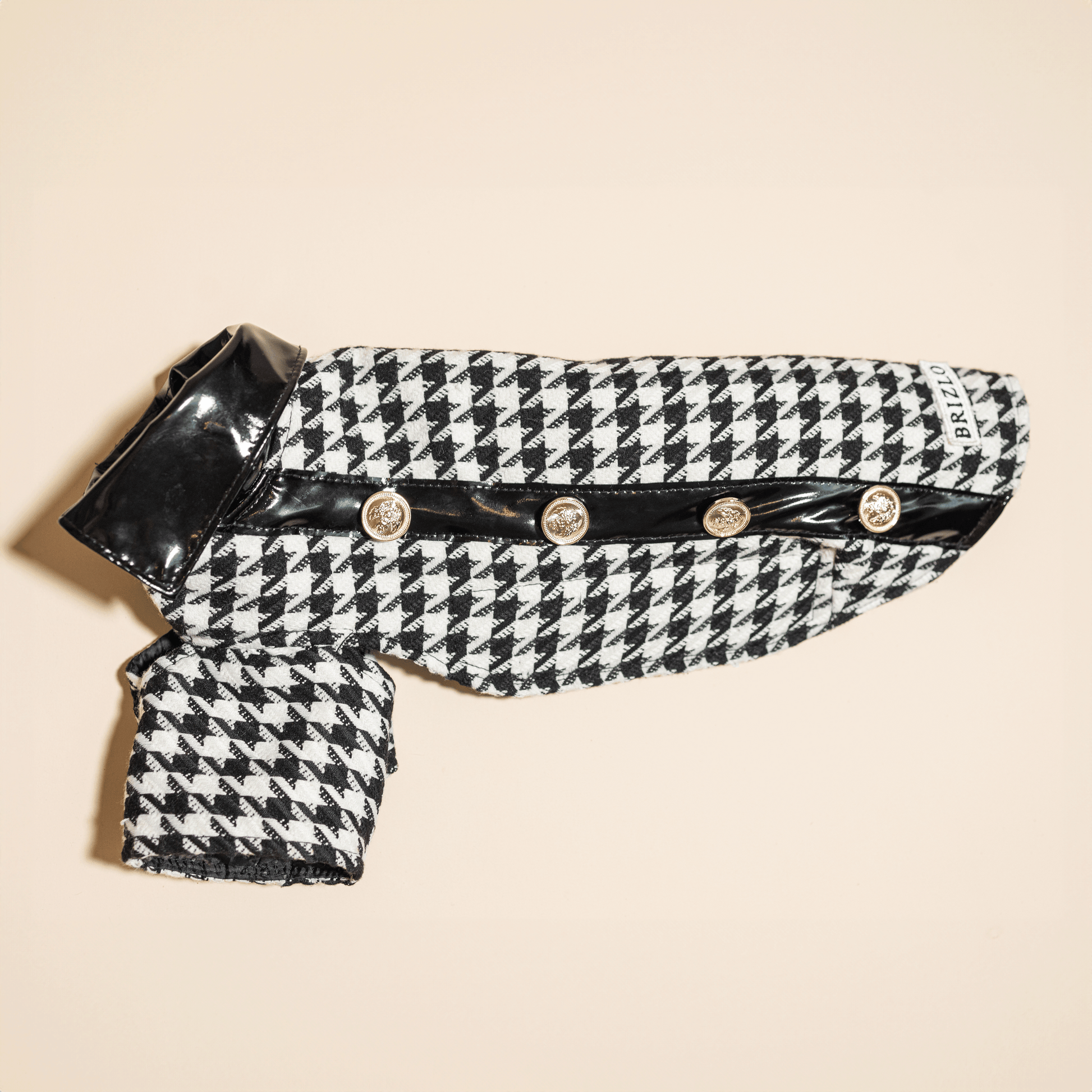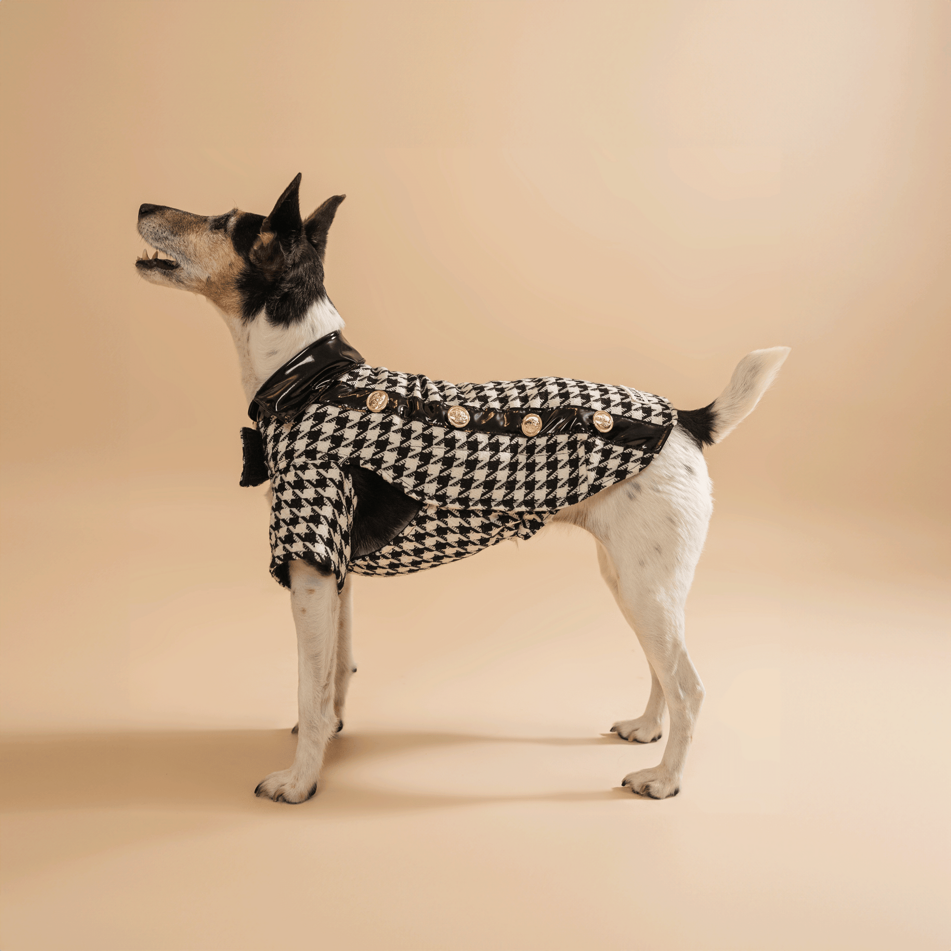 Our “Classy” dress is the epitome of clean elegance. The combination of the houndstooth coat fabric and the black patent leatherette provides a unique style, while the gold metal buttons give the piece elegance and sophistication. This special dress will turn any dog into a true fashion icon.