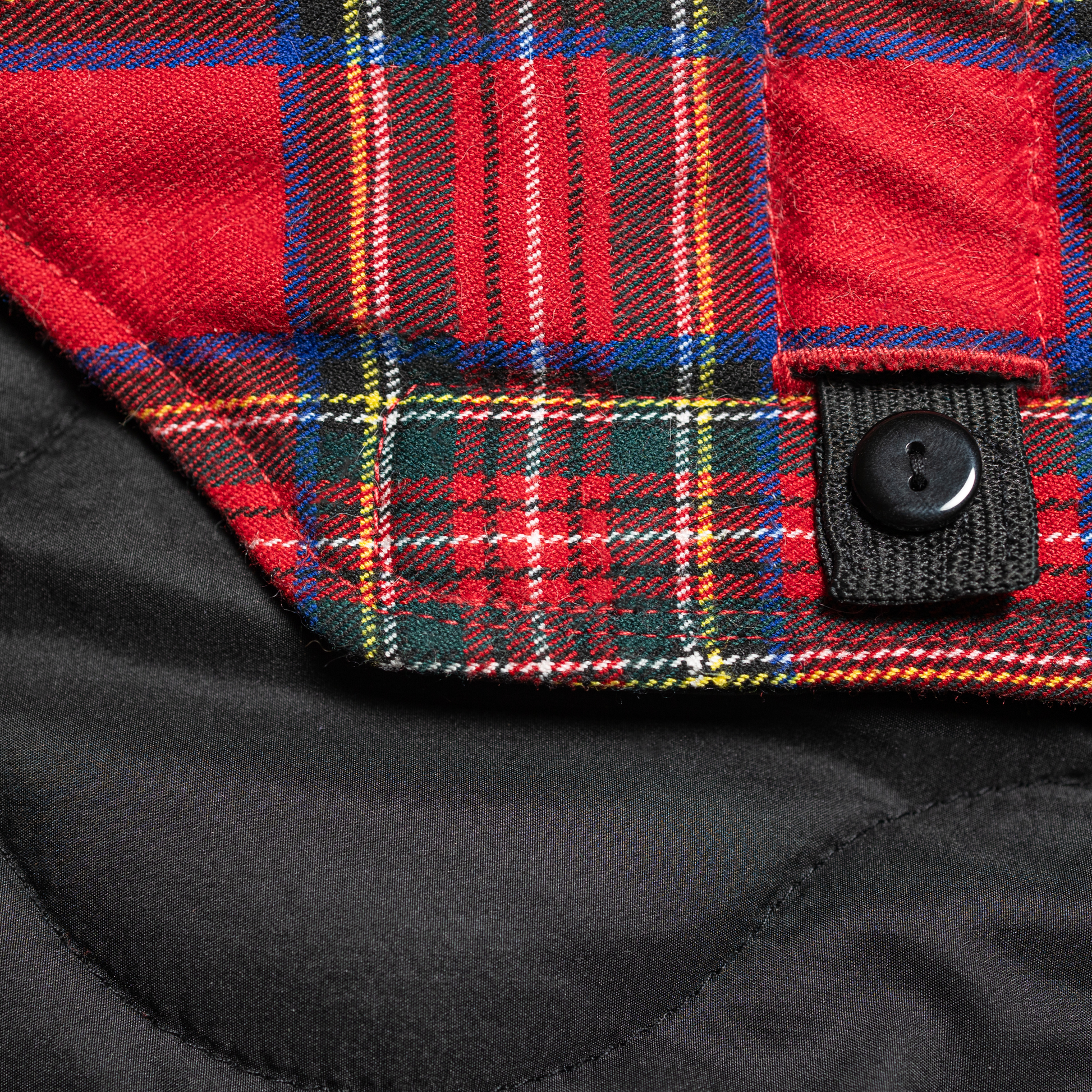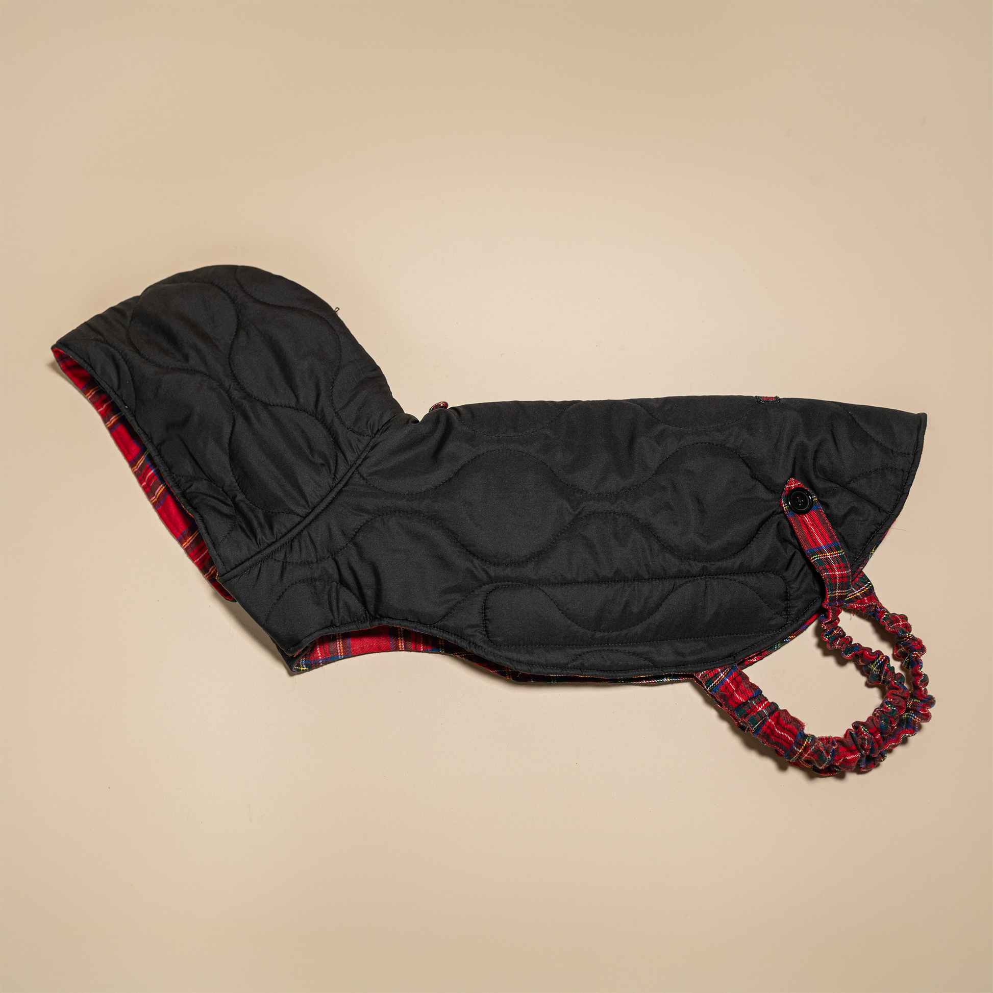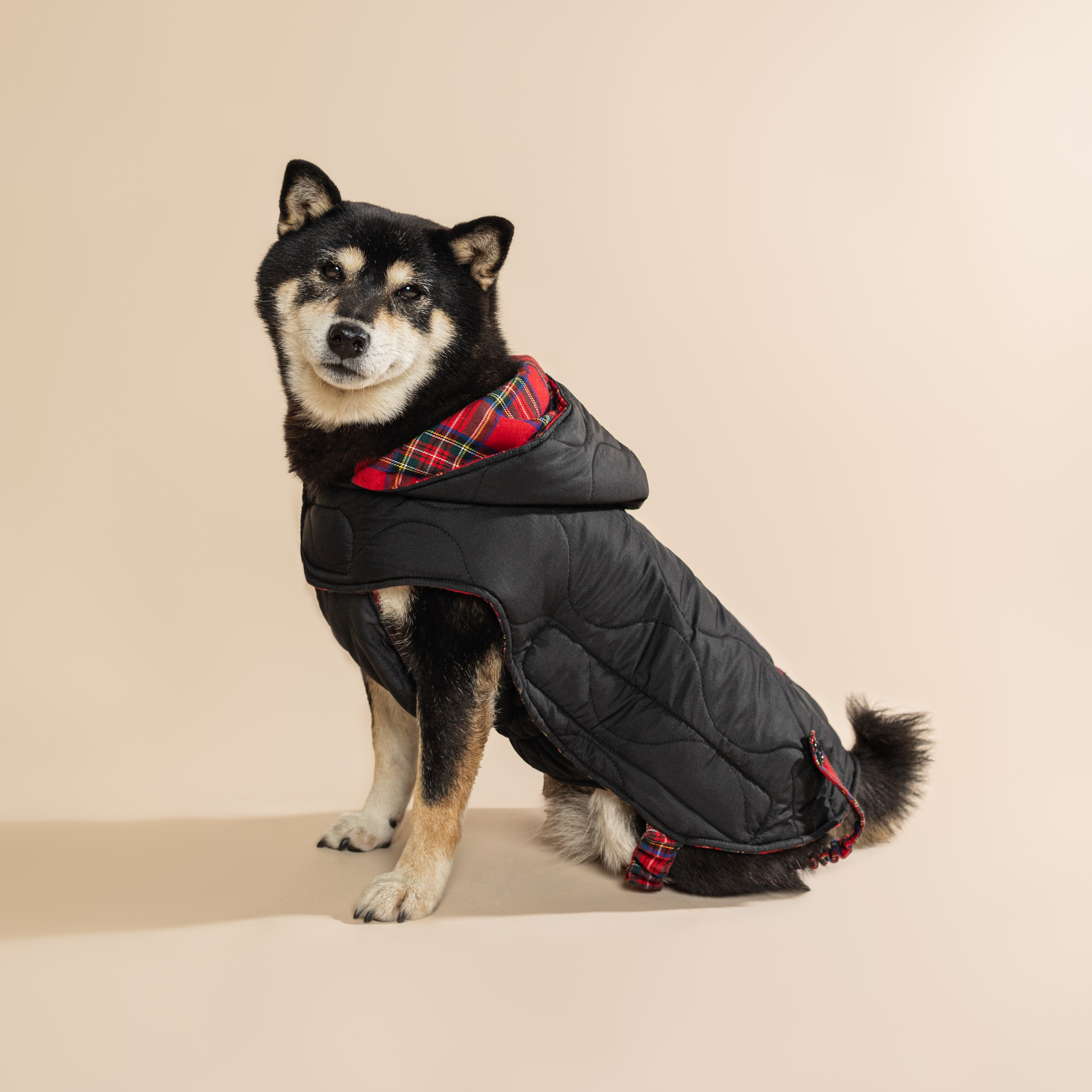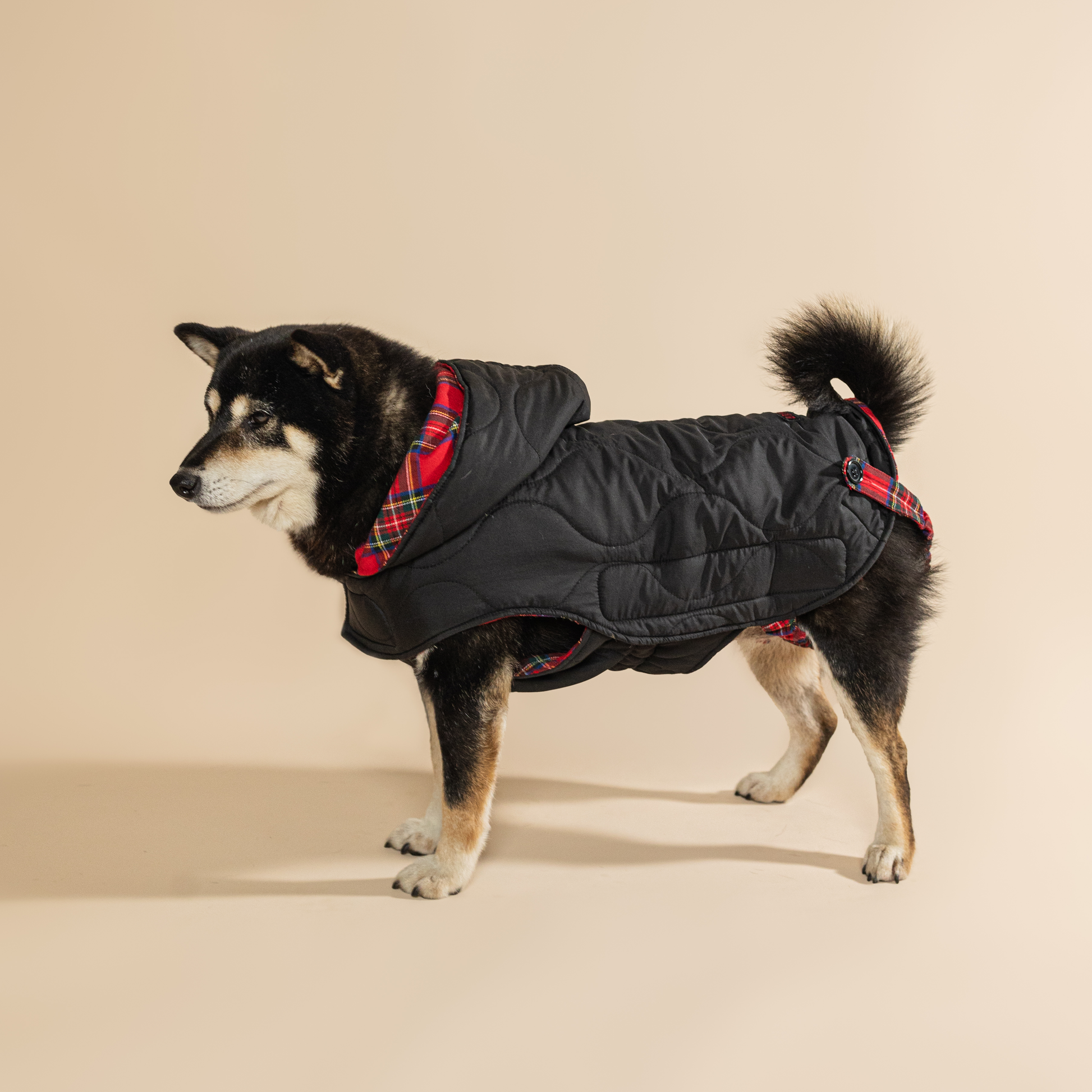 Our puffy jacket evokes the atmosphere of Christmas with its traditional black-and-red color palette, which is really highlighted by the contrast of the Scottish plait inner lining and the black outer jacket material. Our black metal buckles with a fine and clean metallic shine crown the outfit, which can form a particularly good pairing with the owner's accessories or leash. We have provided the perfect combination of aesthetics and practicality in rainy weather with a removable hood, which can be attached as needed, preventing it from falling on the head.
