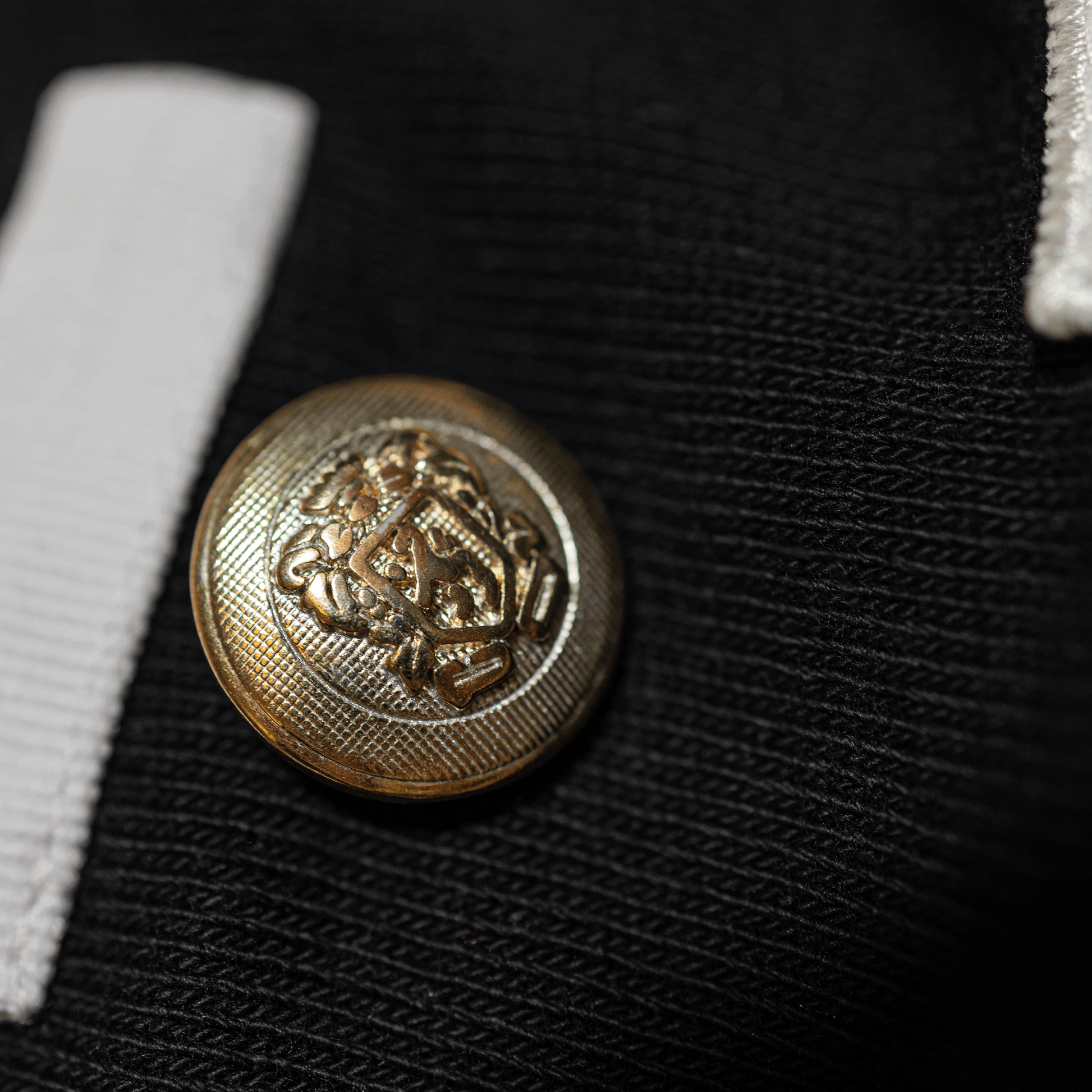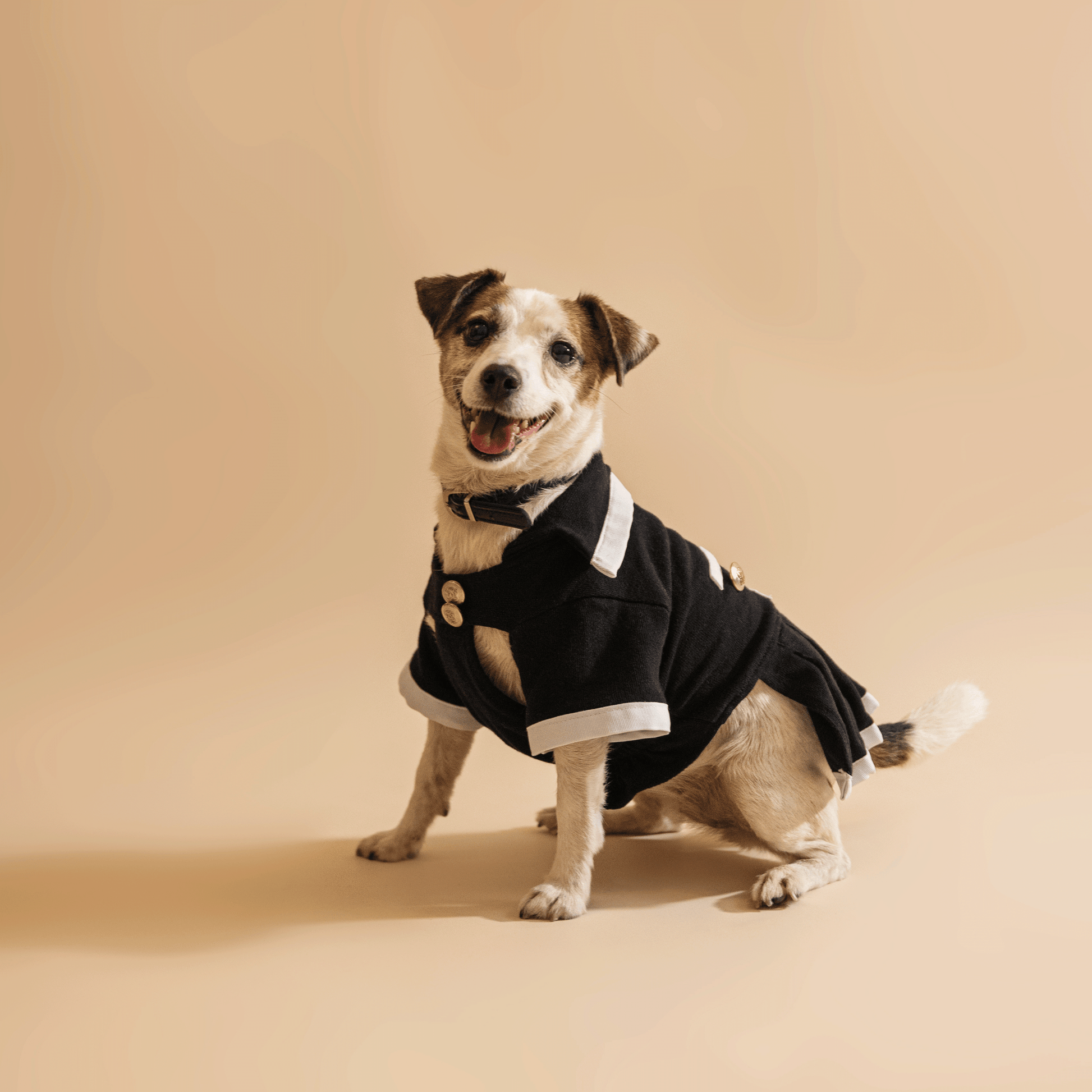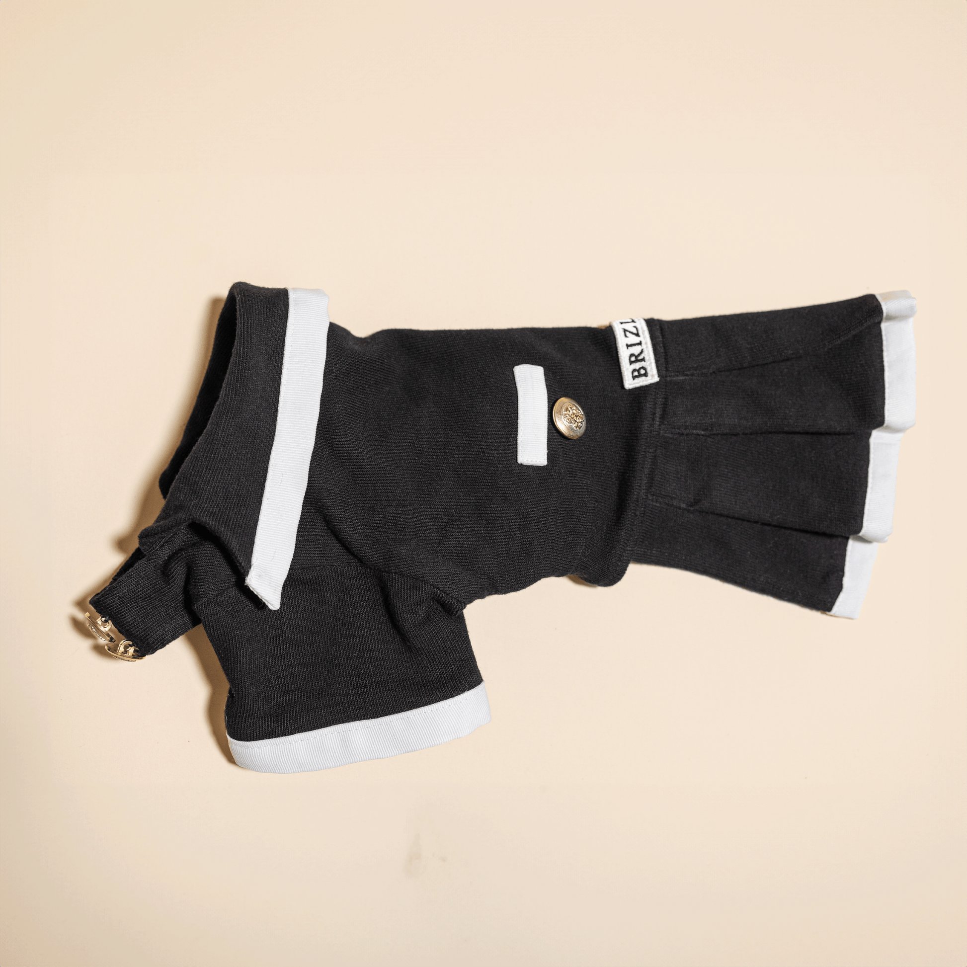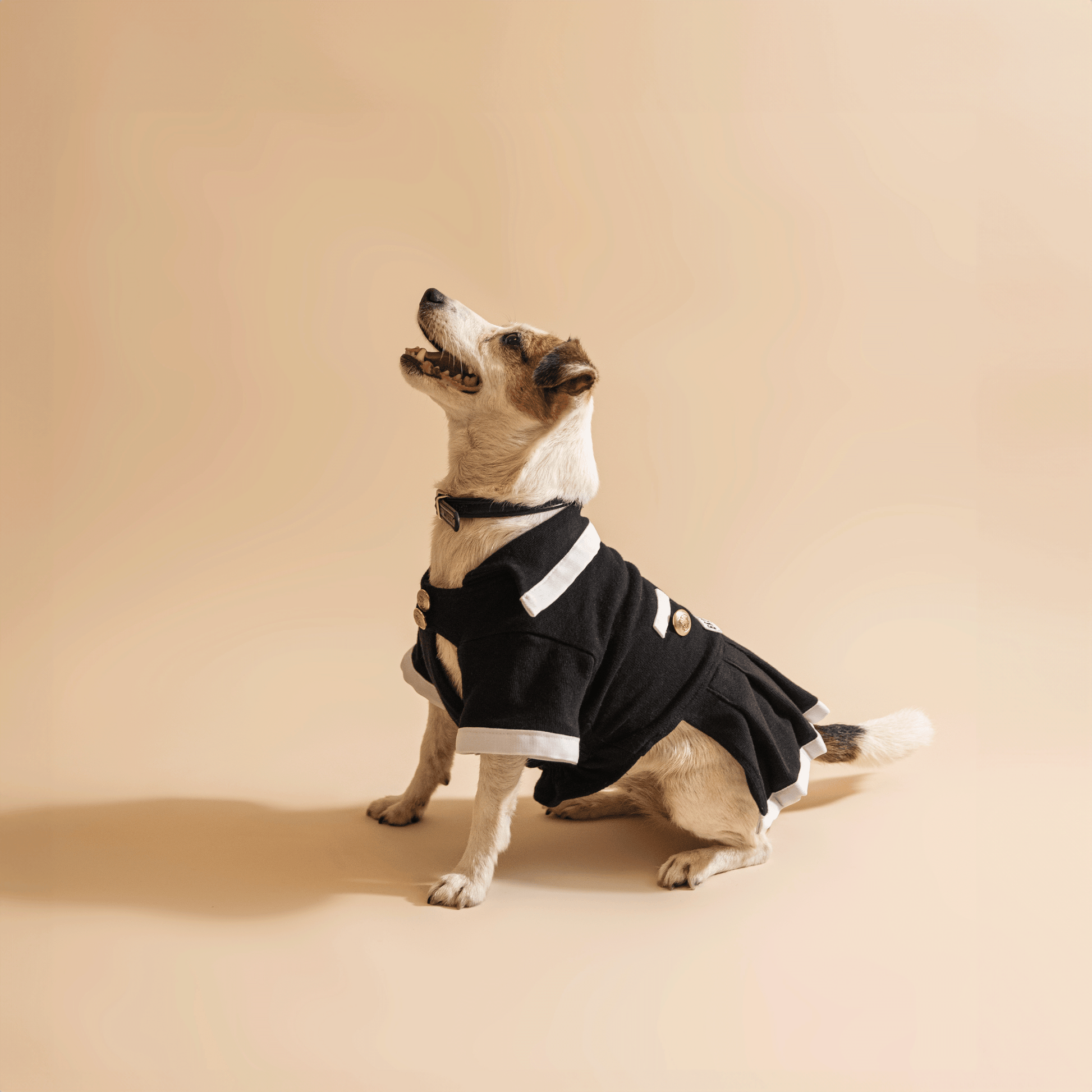 Our “Lady” dress is the embodiment of classic elegance and sophistication, inspired by the timeless style of the British elite. The black, elastic knit fabric and off-white passé with satin ribbon ensure a perfect fit and an elegant look. The exclusive details of the gold metal buttons turn every walk into a stylish event for our four-legged friend.