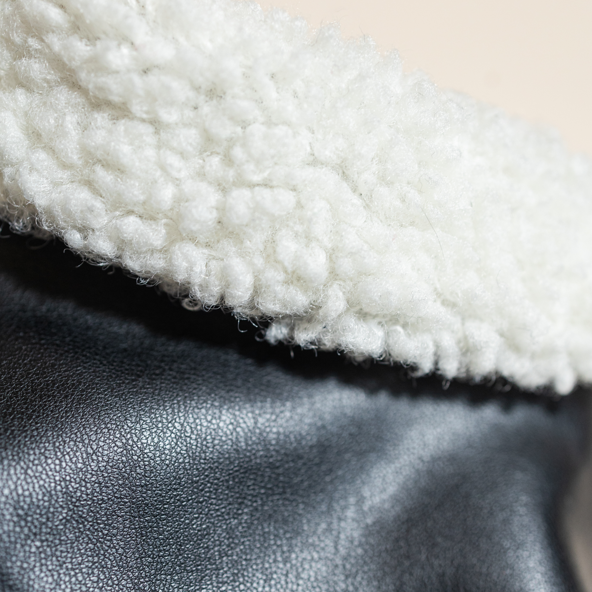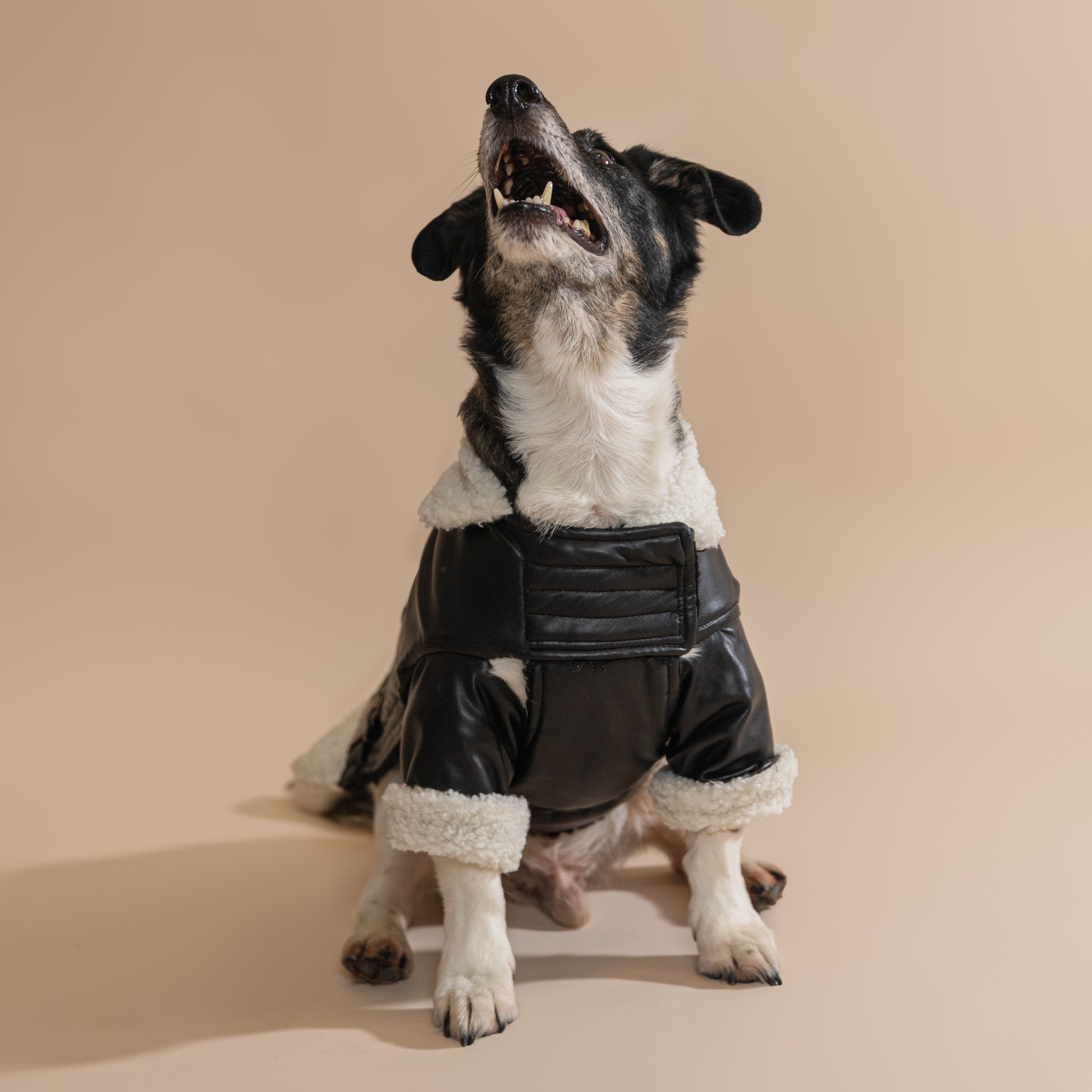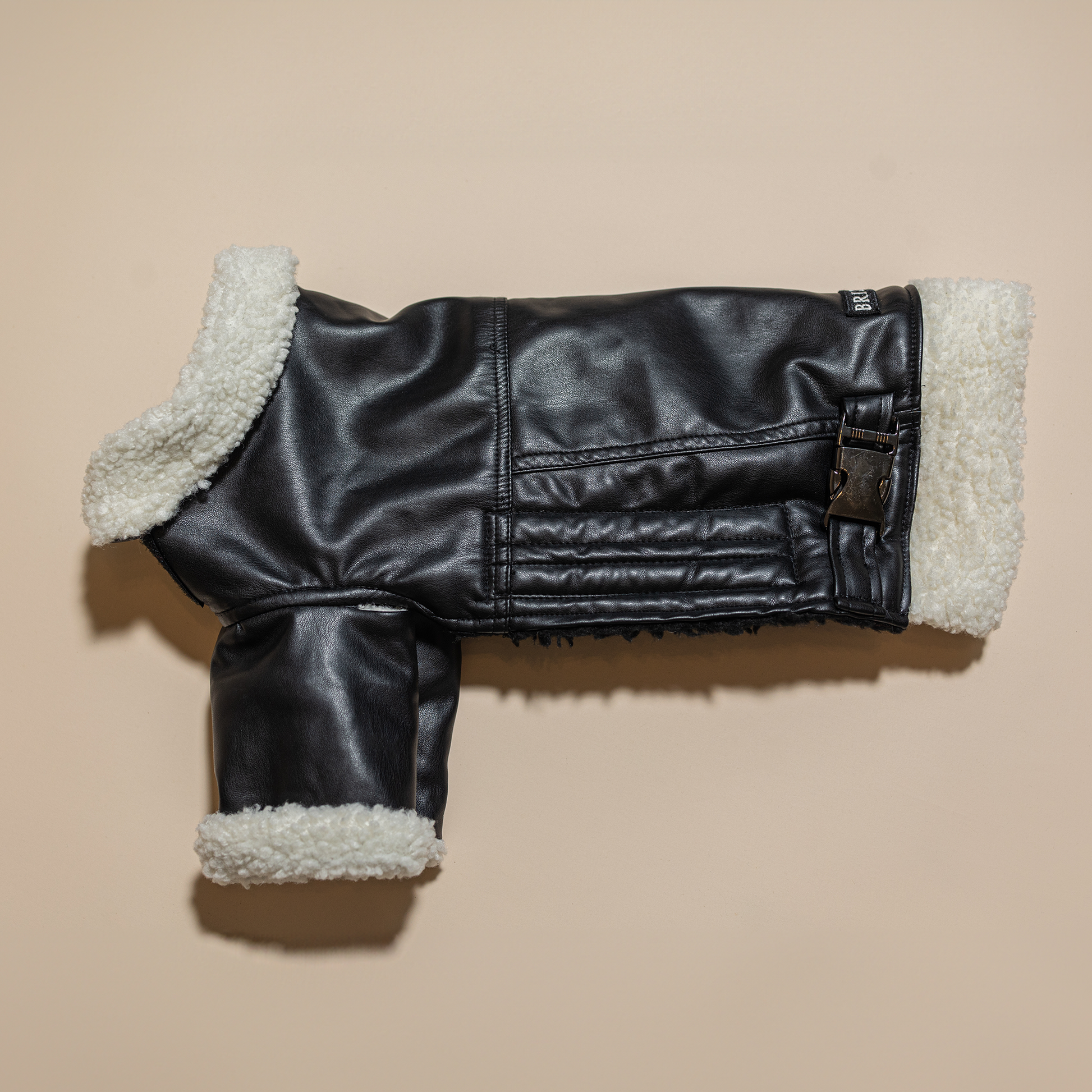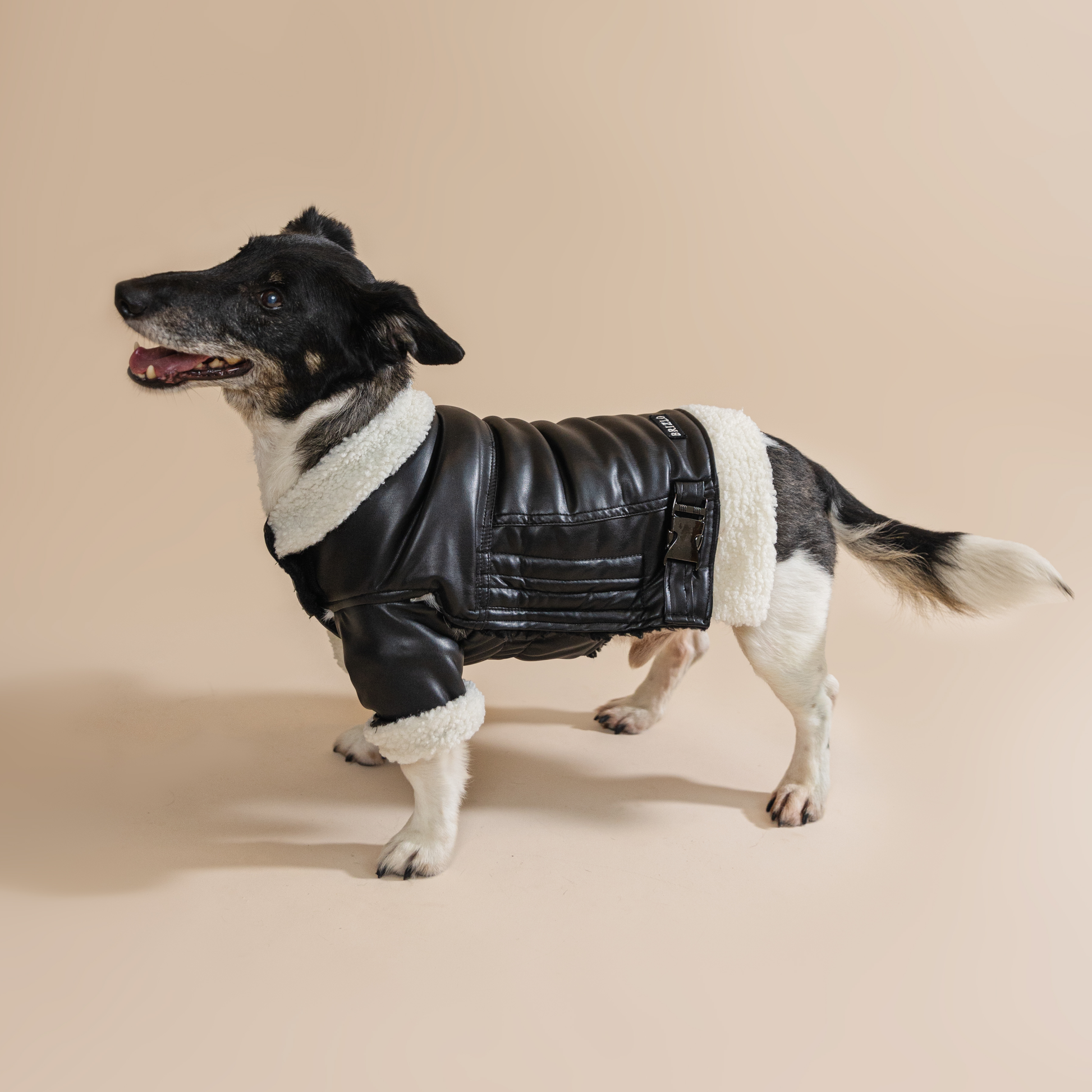 Our Snowmen premium faux leather jacket is an ideal choice for cold winter days. Similar to a quality human leather jacket, it gives the wearer a robust appearance. Its appearance alone radiates elegance, which is lined on the inside with a warm, yet comfortable, soft to the touch off-white artificial leather. Lining appears as a border along the legs, neck and end of the back, creating strong contrasts in color and texture. Our black metal buckles with a fine and clean metallic shine crown the outfit, which can form a particularly good pairing with the owner's accessories or leash.
