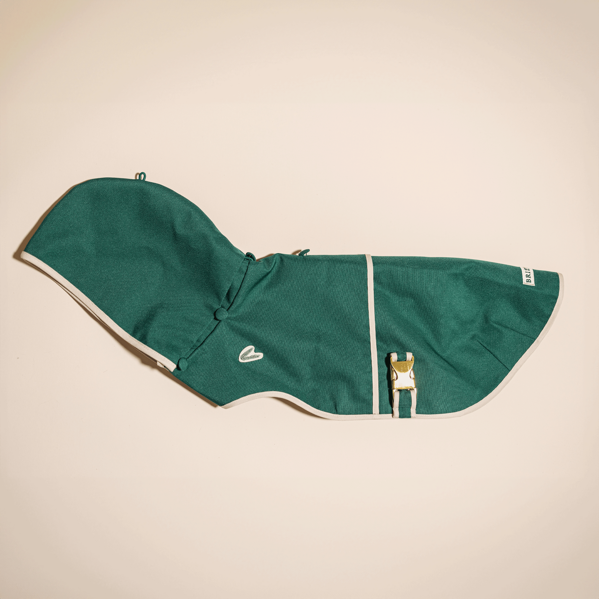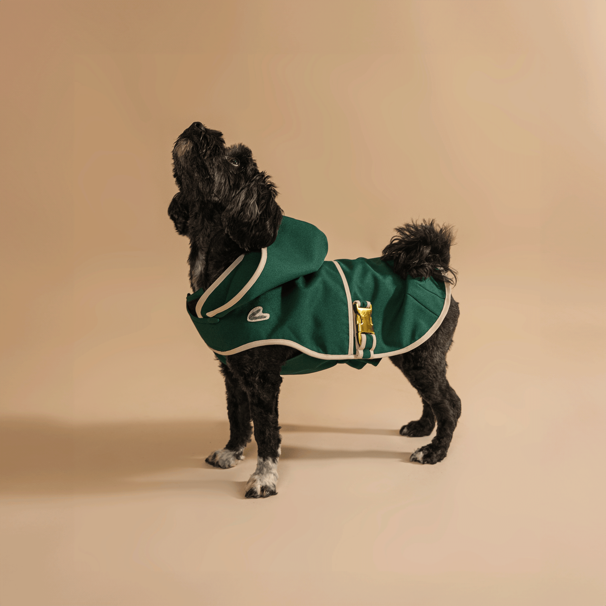 While maintaining its technical functionality, it can be put on with a quick movement, but its light, airy appearance is still preserved. By choosing the color emerald green, we want to bring a little cheer into the gray days. Our gold-colored metal buckles, white borders and emerald green fabric bring life to the dress while strengthening the feminine features. By combining aesthetics and practicality, we supplemented it with a removable hood, which can be attached as needed, preventing it from falling on the head.